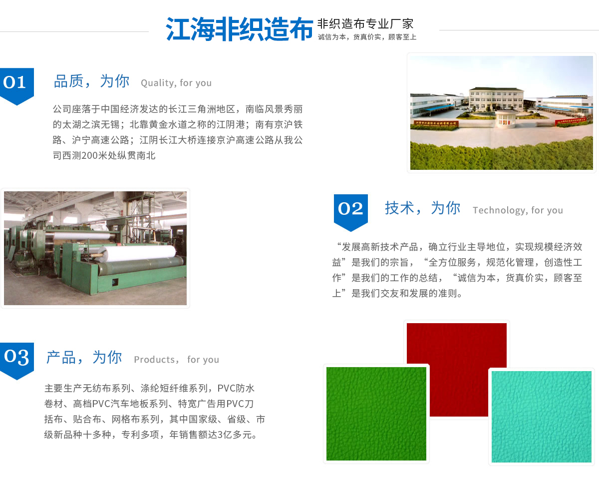 江海企業(yè)有江陰市江海非織造有限公司、江陰市江海防水材料有限公司、江陰市三江寬幅無紡布有限公司、江陰市三江織物涂層新材料有限公司組成,均屬于江蘇省民營科技企業(yè)。企業(yè)現(xiàn)擁有員工近千名,占地15萬平方米,廠房建筑面積達(dá)80000多平方米,凈資產(chǎn)超億元,主要生產(chǎn)無紡布系列、滌綸短纖維系列、PVC防水卷材、高檔PVC汽車地板系列、特寬廣告用PVC刀括布、貼合布、網(wǎng)格布系列,其中國家級、省級、市級新產(chǎn)品十多種,專利多項,年銷售額達(dá)3億多元。